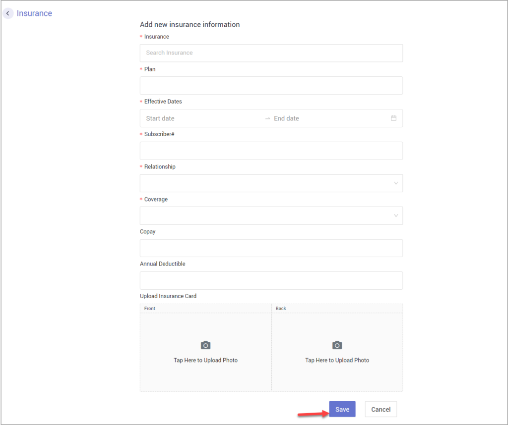 Provide all the necessary information, upload pictures of the insurance card front and back, and click on Save.