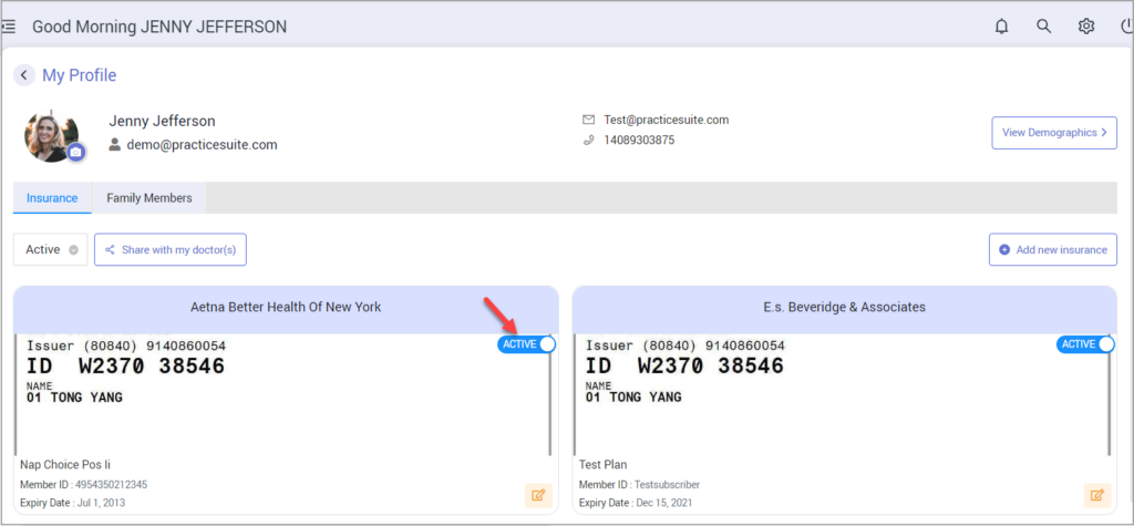 If you wish to remove any insurance from HelloHealth, Click the ‘ Active’ button on the top right of the insurance (see Image below).