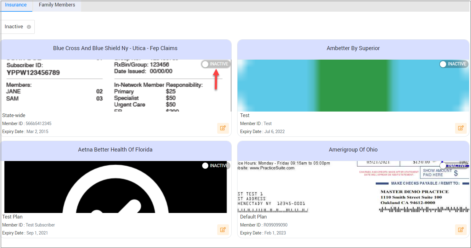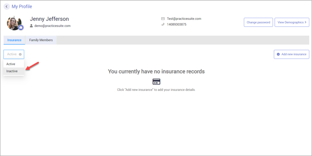 Note: You can view all inactive insurances by selecting “Inactive” from the drop-down in the insurance tab.