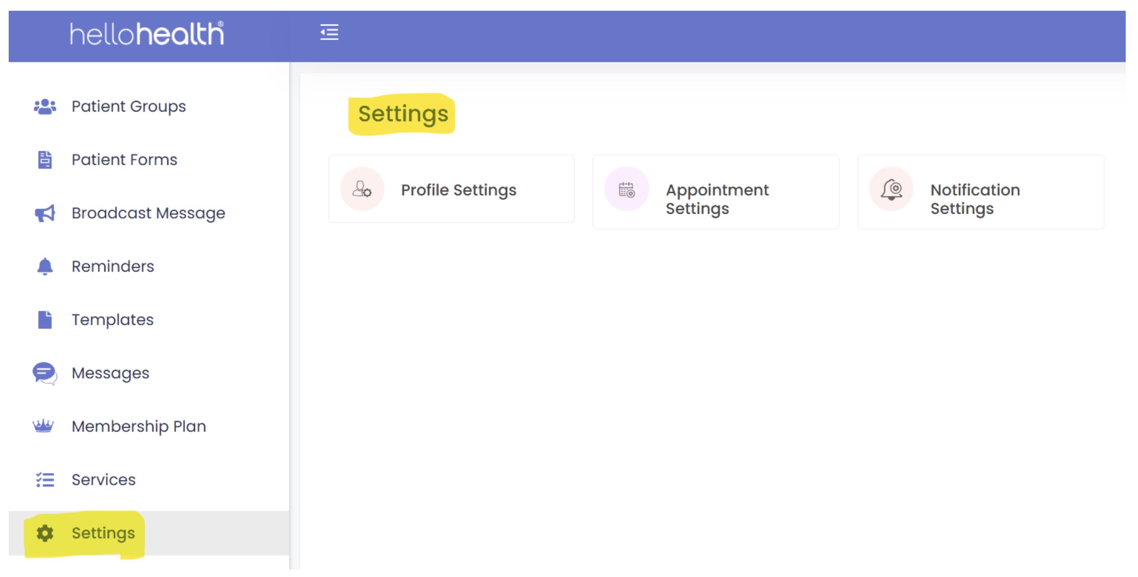 Once you are logged in to HelloHealth, go to the Settings tab. Here, you can manage and configure your personal profile, appointment settings, and notifications.