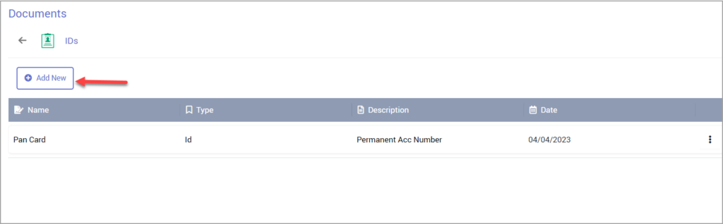 Click on ‘IDs’ or ‘Other Documents’, whichever is relevant for your document, and click on ‘Add New’ provided on the top left.