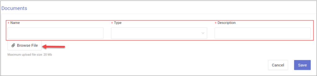 Provide a name and description for your document and select the type from the drop-down provided. Browse and upload the file using the ‘Browse File’ button.
